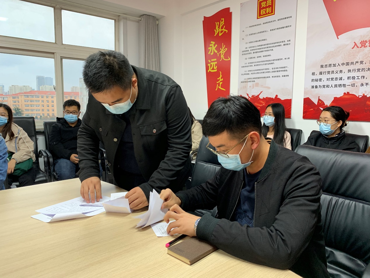 会上,马振秀同志对会议流程进行了简要说明。预备党员窦圣超、谢清月按要求依次宣读转正申请书,并从思想、生活、学习、工作以及自身的不足之处等方面向党组织汇报了自己在一年预备期内的情况。随后,培养联系人马振秀、张宇航向与会成员分别介绍了对两位预备党员的培养考察情况,其他党内同志也对两位预备党员能否按期转正进行讨论并充分发表了意见。最终,经过无记名投票表决,一致同意窦圣超、谢清月两位同志按期转为中共正式党员。两位转正党员向党组织表达了自己加入中国共产党的坚定决心,表示自己在接下来的学习生活中将充分发挥党员的模范带头作用,向优秀党员学习,严于律己、踏实工作。