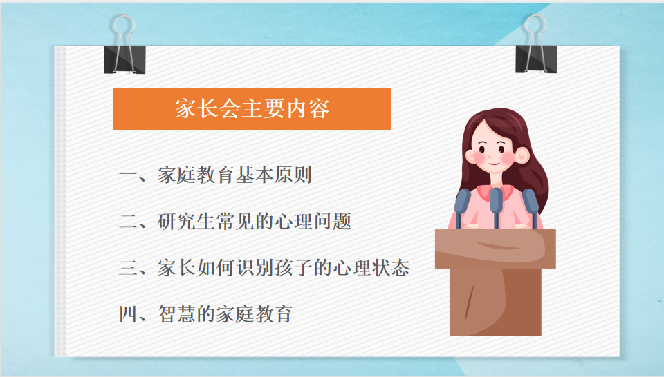 此次主题家长会,围绕 “家庭教育的基本原则”、“研究生常见的心理问题”、“家长如何识别孩子的心理状态”、“智慧的家庭教育”四个方面展开。赵岩老师列举形象、生动的教育案例,向各位家长分析了当代研究生的心理状态及常见的心理问题,并针对这些问题提出了几点建议:第一,家长要主动关心子女的生活和学习状况,及时关注子女的动态;第二,学会尊重子女的意见与想法,做好思想教育工作;第三,及时关注子女的心理健康状况,多与子女沟通交流,帮助子女健康成长。