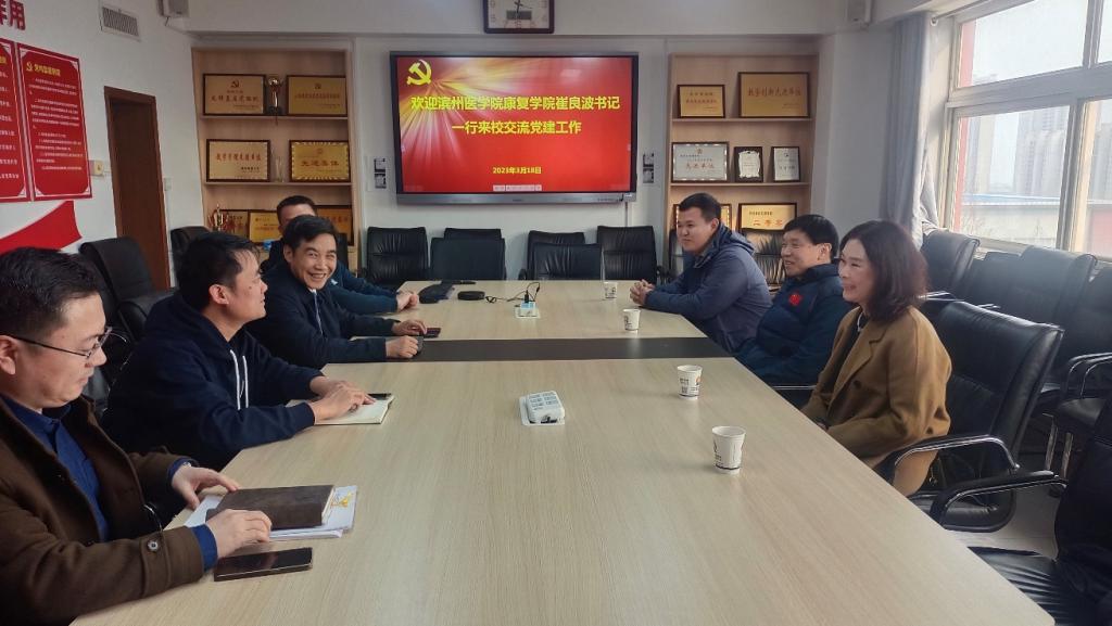 苏占兵对滨州医学院康复医学院一行的来访表示热烈欢迎,随后介绍了学院基本情况,详细介绍了学院培育创建“山东党建工作标杆院系”的思路、方案、工作举措与取得成效。刘伟、于伟结合学生党员培养和课程思政等方面的典型做法做了交流。