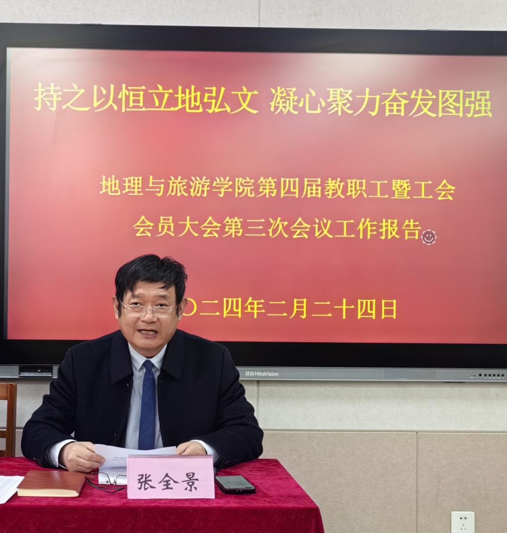 张全景在工作报告中指出,2023年全院师生认真学习贯彻习近平新时代中国特色社会主义思想,胸怀国之大者,潜心教书育人,顽强拼搏,勇毅前行,开新局、展新貌,创新绩、发新质,较好完成了各项任务,主要发展指标增幅在全校排名靠前,取得了可喜可贺成绩。一是党建引领培根铸魂。顺利通过“山东省党建标杆院系”验收,完成“一院一品”校园文化精品培育项目建设任务,获批学校全面从严治党示范学院、课程思政示范学院建设项目;二是专业建设成效显著。地理科学专业、旅游管理专业上榜中国大学专业排名,均获“B+”评级;1门课程获批国家一流本科课程, 1门课程获批省级课程思政示范课程,2门课程推荐参评国家一流本科课程。获得山东省教改重点项目1项、校级教改课题3项,获得省级本科高校黄河重大国家战略课程思政优秀案例2项;三是学科建设稳步推进。以地理学一级学科博士学位授权点申请基本条件为引领,持续强化学科特色,补短板、强弱项,做大做强自然地理学、人文地理学、地图与地理信息科学、自然资源调查与国土空间规划学等学科方向, 2位教授获得地理学博士生导师资格;四是平台建设亮点纷呈。获批山东省文化和旅游重点实验室(精品旅游业态创新与标准化建设重点实验室)、山东省普通高等学校实验教学示范中心(地理科学实验教学示范中心)、山东省普通高等学校示范性实习(实训)基地(国土利用与信息化产教融合示范性基地)、山东省普通高等学校示范性基层教学组织(电影天堂