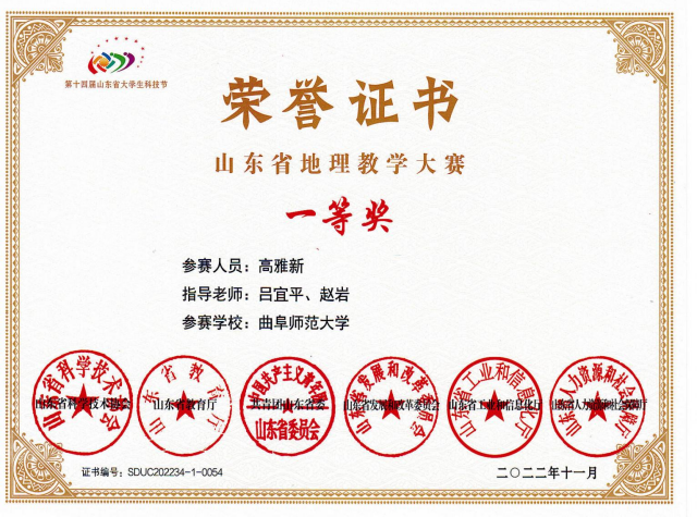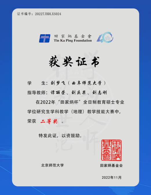 在专业实践比赛方面,3位同学在“田家炳”全日制教育硕士专业学位研究生教学技能大赛,2位同学在全国地理研学方案设计大赛中获奖,18位同学在第十四届山东省大学生科技节——山东省地理教学大赛中斩获佳绩。