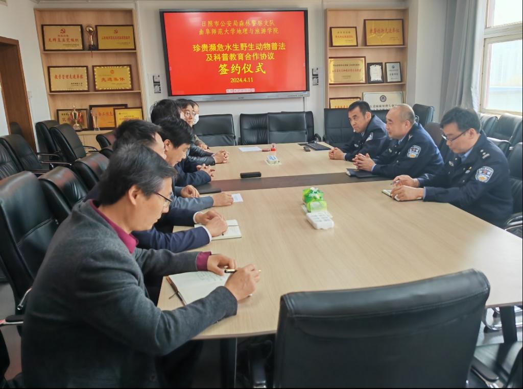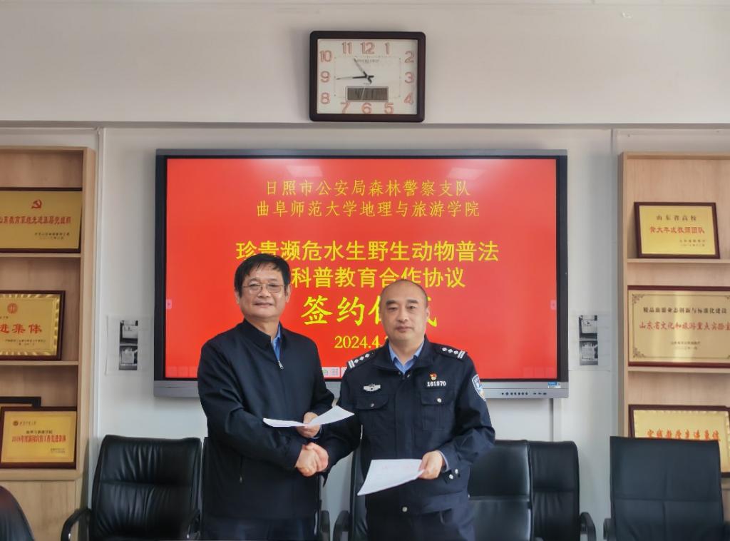 与日照市公安局森林警察支队签订“珍贵濒危水生野生动物普法与科普教育合作协议”。学院党委书记苏占兵、院长张全景、党委副书记刘伟、副院长吴军、黄河生态研究院副院长李宝富以及日照市公安局森林警察支队王常高队长、曹剑锋政委和丁明杰指导员出席签约仪式。