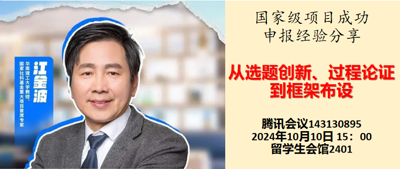 10月10日下午,学院通过线上和线下相结合的方式召开2025年度国家级项目申报启动会。会议邀请华南理工大学二级教授、国家社科基金重大项目首席专家江金波教授作“国家级项目成功申报经验分享——从选题创新、过程论证到框架布设”的学术报告。学院40多位专业教师参加了报告会。报告会由副院长吴军主持,院长张全景担任与谈人。