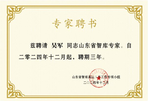 近年来,学院根据学校部署,聚焦服务黄河重大国家战略,开设黄河相关特色通识课程,开展黄河课程思政,并围绕黄河流域开展了多学科综合研究,取得了丰硕成果。吴军教授此次获聘省智库专家,将助力学院为进一步服务黄河重大国家战略贡献曲师智慧和力量。