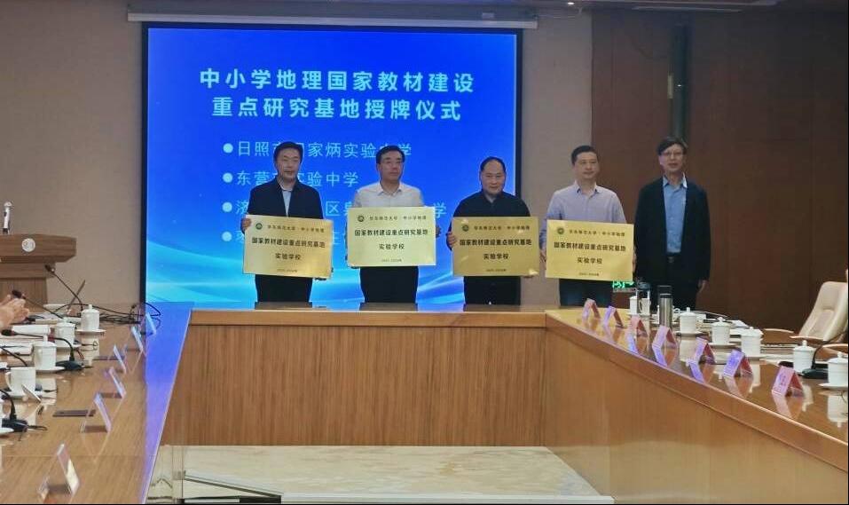 日照市田家炳实验中学、东营市实验中学、济南市市中区泉泽初级中学、枣庄市台儿庄古城学校、乳山市银滩高级中学、烟台经济技术开发区王懿荣高级中学、邹平市第二中学、山东省垦利第一中学、德州市实验中学、山东省潍坊第四中学等十所实验学校被授予中小学地理国家教材建设重点研究基地实验学校,段玉山教授依次为十所实验学校授牌。