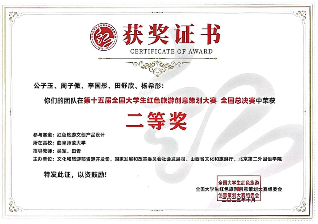 作为教育部全国大学生思想政治工作精品项目,本届大赛由文化和旅游部资源开发司、国家发展和改革委员会社会发展司等多部门联合主办,以“铸就红色理想,书写创意青春”为主题,聚焦纪念中国人民抗日战争暨世界反法西斯战争胜利80周年,设置“红色旅游线路设计”“红色旅游营销方案设计”“红色旅游文创产品设计”“红色足迹微视频”“红色精神微讲解”“红色故事微漫画”六大赛道。大赛共吸引包括北京师范大学、华东师范大学、中山大学等高校在内的1001所高校、6002支队伍、3万余名师生积极参与,累计收到参赛作品5144项。赛事采用“初赛+决赛”两级选拔机制,各赛道仅前10名作品可晋级总决赛,整体入选率低至1.17%,竞争异常激烈。总决赛期间,60支入围队伍聚焦武乡丰富的红色资源,通过情景展示、视频路演等创新形式,为当地红色旅游发展注入青春智慧。其中,由吴军、田青老师指导的作品《延脉相承,红色铸魂》和《太行军武智玩》(学生团队:公子玉、周子傲、李国彤、田舒欣、杨希彤)以优异成绩获“红色旅游文创产品设计赛道”二等奖,吴军、田青老师分别获最佳指导教师奖。公子玉同学作为参赛代表队伍接受中国旅游报的采访,充分彰显电影天堂