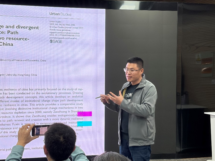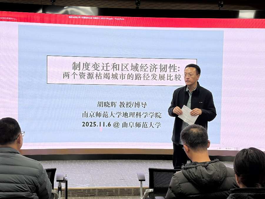 特邀南京师范大学校中青年领军人才、博士生导师胡晓辉教授做客“经纬讲堂·高端讲坛”,为学院师生作了题为《制度变迁与区域经济韧性:两个资源枯竭城市的路径发展比较》的学术报告。学院相关专业教师及研究生参加了此次报告会。