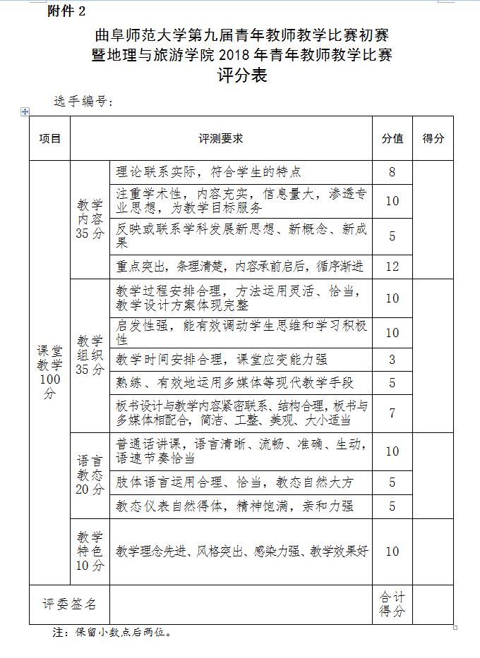比赛依据学校《关于举办第九届青年教师教学比赛的通知》中的评分标准进行评分。