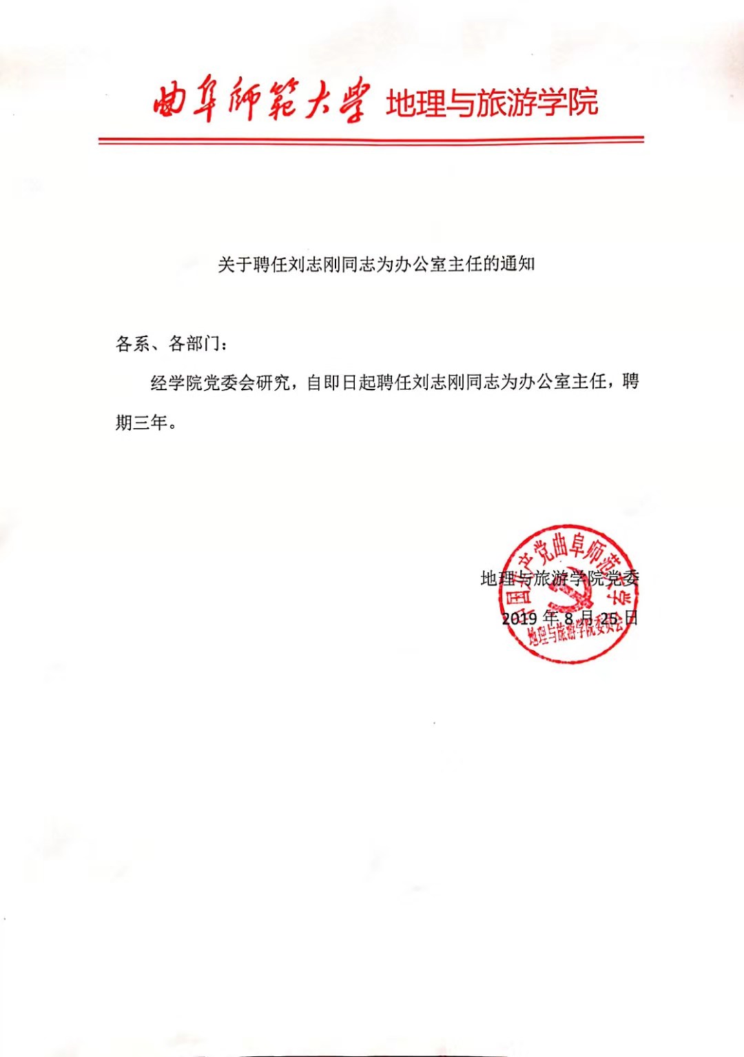 关于聘任刘志刚同志为办公室主任的通知