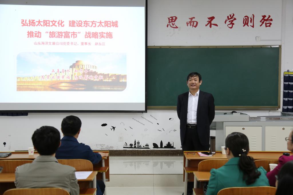 为进一步提高我校旅游管理硕士(MTA)和本科生培养质量,强化专业素养和实践能力,促进校企合作,4月24日,MTA专题讲座暨“经纬讲堂”高端论坛系列之“弘扬太阳文化 建设东方太阳城”报告会于S213教室举行。报告会邀请教授级工程技术应用研究员、山东海洋文化旅游发展有限公司党委书记、董事长赵东江担任主讲人。