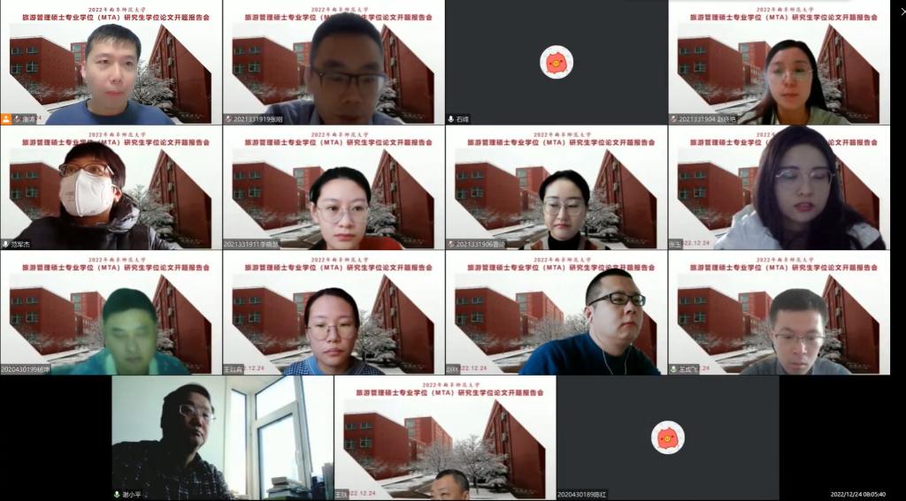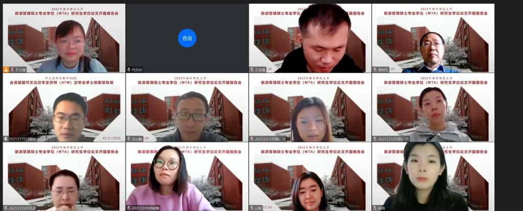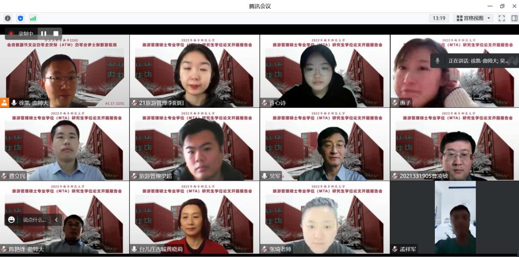 2022年12月24日上午,旅游管理专业学位硕士研究生(MTA)学位论文开题报告会通过腾讯会议举行。共计23名旅游管理(MTA)研究生做了开题报告,15位校内导师作为论证专家听取了报告并进行了充分论证和细心指导。报告会还邀请了沂南县彩蒙景区管委会党委黄树田书记、山东省台儿庄古城旅游集团有限公司黄晓莉副总经理、日照东方太阳城文化旅游研究院有限公司范军杰董事长三位业界专家参加了论证。